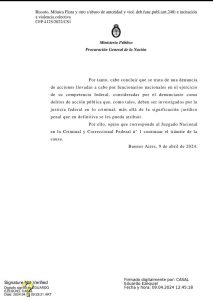 Ante el conflicto negativo de competencia suscitado entre el Juzgado Nacional en lo Criminal y Correccional Federal n° 1 y el Juzgado Nacional de Primera Instancia del Trabajo n°66 , en la causa “ Rissoto, Mónica Flora y otro s/abuso de autoridad y viol. deb.func.publ.(art.248) e incitación a violencia colectiva” CFP 4125/2022/CS1 el Procurador de la Corte Suprema de Justicia de la Nación , Eduardo Ezequiel Casal dictamino: que se trata de una denuncia de acciones llevadas a cabo por funcionarios nacionales en el ejercicio de su competencia federal, consideradas por el denunciante Carlos Luis Elias, como delitos de acción pública que, como tales, deben ser investigados por la justicia federal en lo criminal, más allá de la significación jurídico penal que en definitiva se les pueda atribuir. Por ello, opina que corresponde al Juzgado Nacional en lo Criminal y Correccional Federal n° 1 continuar con la investigación de los delitos denunciados contra las autoridades de la Dirección Nacional de Asociaciones Sindicales por haberle otorgado la certificación de autoridades al Consejo Directivo de SUTECBA, siendo que los comicios, han sido cuestionados en sede judicial.